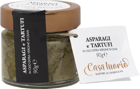 Paté di Asparagi é Tartufo, Fekete szarvasgomba és spárga pástétom. Összetevők: spárga 60%, fekete szarvasgomba (sp. tuber aestivum) 10%, extra szűz olívaolaj, citrom juice, só, fűszerek.
